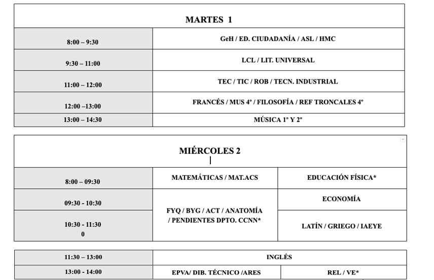 • En caso de no aparecer en el horario, la asignatura pendiene del curso anterior se evaluará a la misma hora que la asignatura del curso actual.