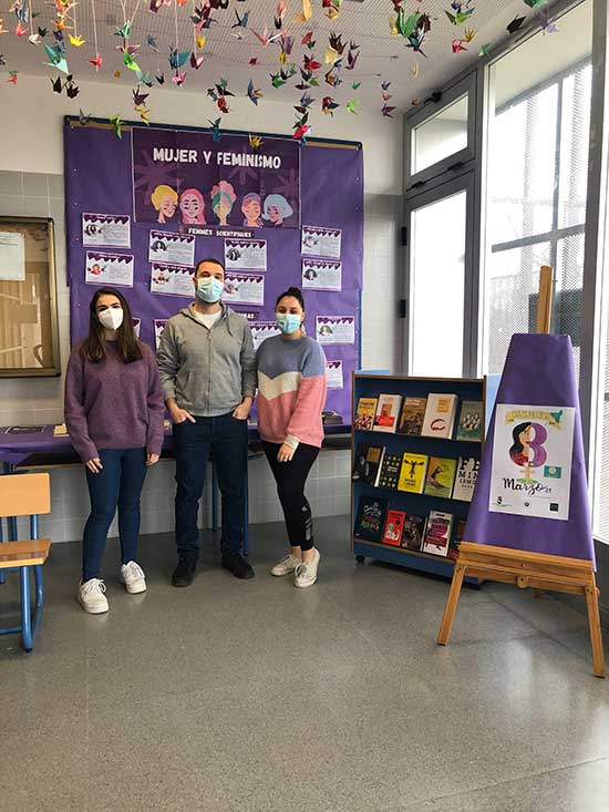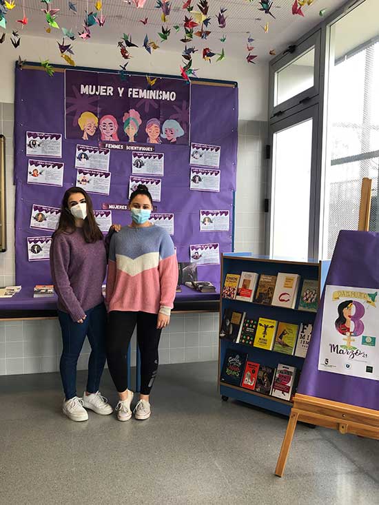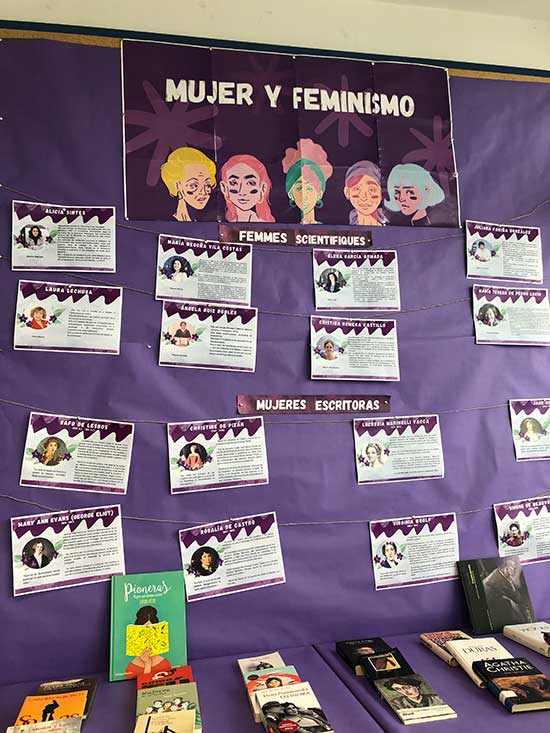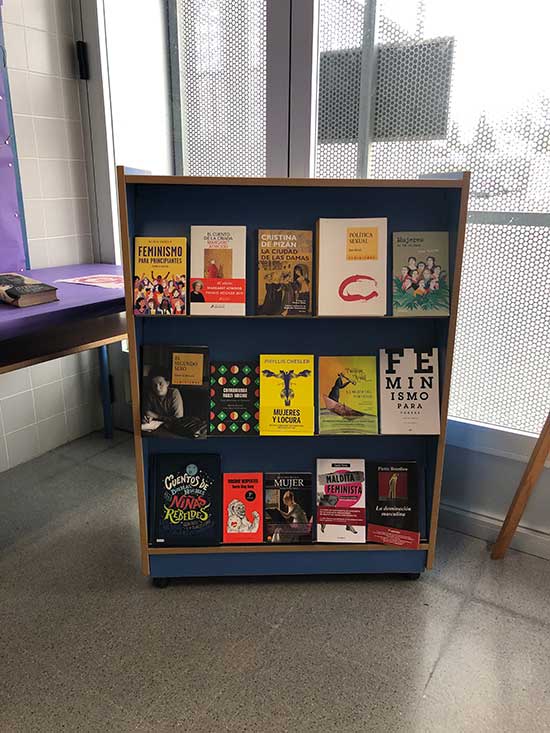 Esta imagen es la que nos encontramos en la entrada del IES Palomares, un espacio reservado a la mujer y el feminismo, actividad que se ha llevado a cabo desde la asignatura de Literatura Universal de 1º de Bachillerato. Podemos encontrar títulos como Feminismo para principiantes de Nuria Valera, El segundo sexo de Simone de Beauvoir o La dominación masculina de Pierre Borurdieu. Además, también vemos en la imagen un mural en el que se recogen figuras de mujeres científicas y escritoras que han tenido un papel decisivo en la historia, acompañado del cartel ganador del día de la mujer.